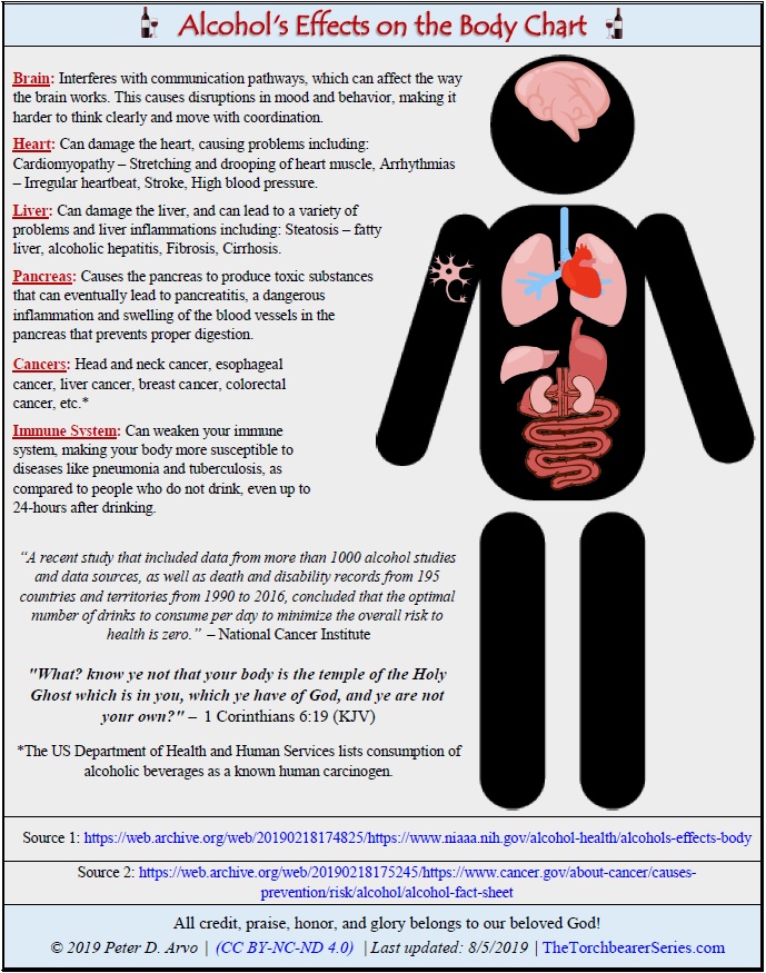4. We learned through this research that alcohol causes cancer and other harm to the body and that there is no safe amount per WebMD55, the National Institute on Alcohol Abuse and Alcoholism, which is a division of the National Institute of Health56, 57 and the National Cancer Institute58. Also see the Alcohol’s Effects on the Body Chart.