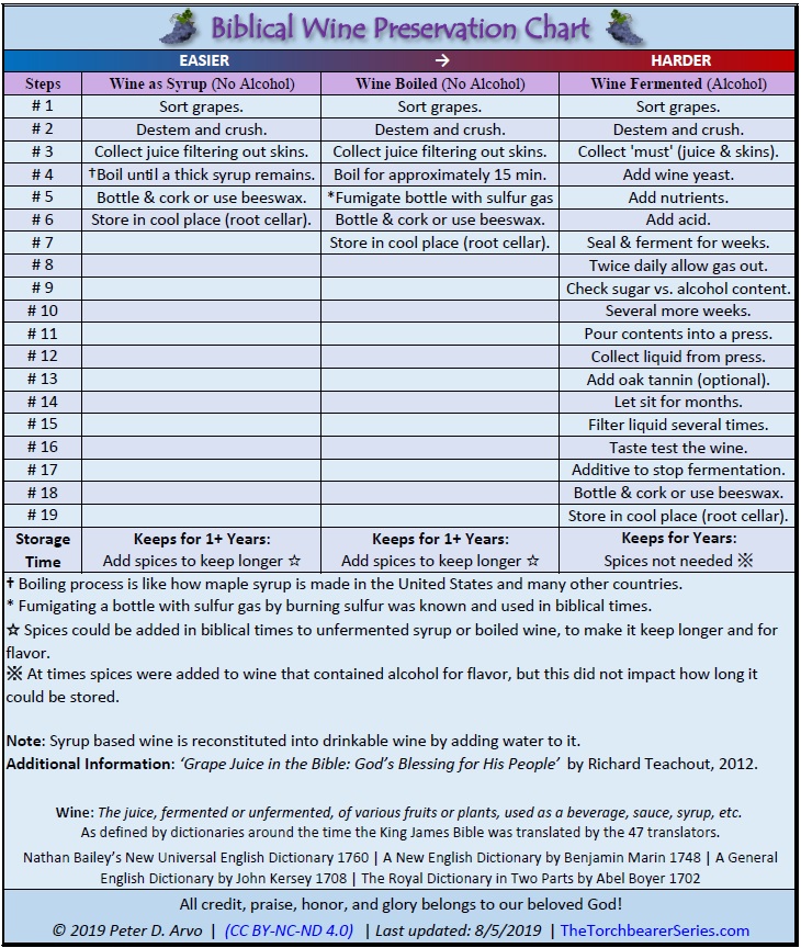 5. It is more difficult to preserve juice from grapes by making alcoholic wine as compared to other methods. For example, boiling and jarring the liquid from grapes or boiling it into syrup has fewer steps. See the Biblical Wine Preservation Chart for details.