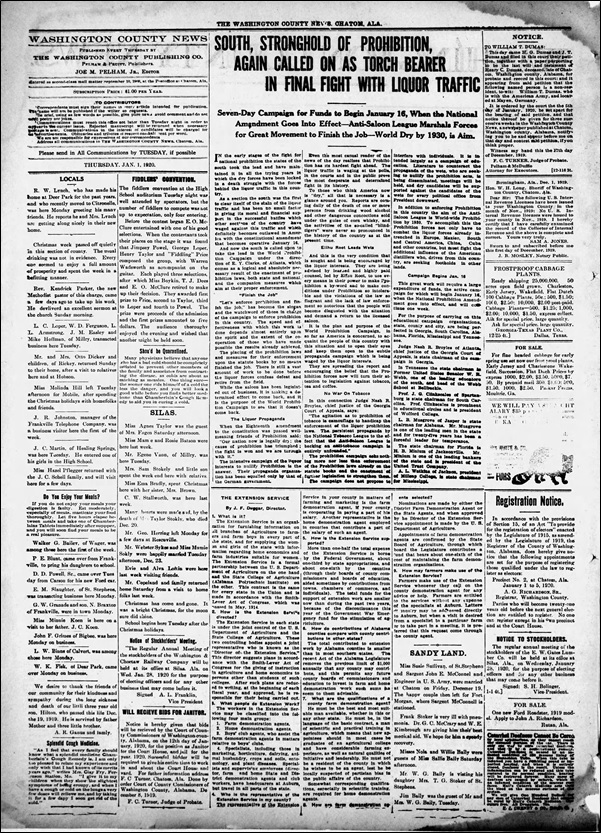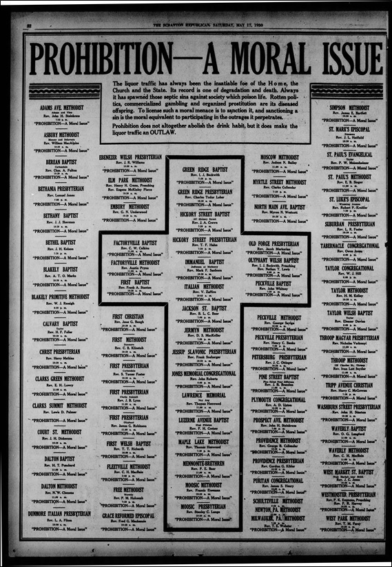 16. Many churches were against alcohol and considered it a great moral issue during the Prohibition time period, except for Roman Catholic and German Lutheran communities who were in favor of alcohol use. See the newspaper ad in The Scranton Republican, Saturday, May 17, 1930, which was paid for by Methodist, Baptist, Presbyterian, Episcopal, Congregational, and Evangelical denominations against alcohol use. Another newspaper article about Prohibition uses the term "Torch Bearer" in Washington County News, Thursday, January 1, 1920.