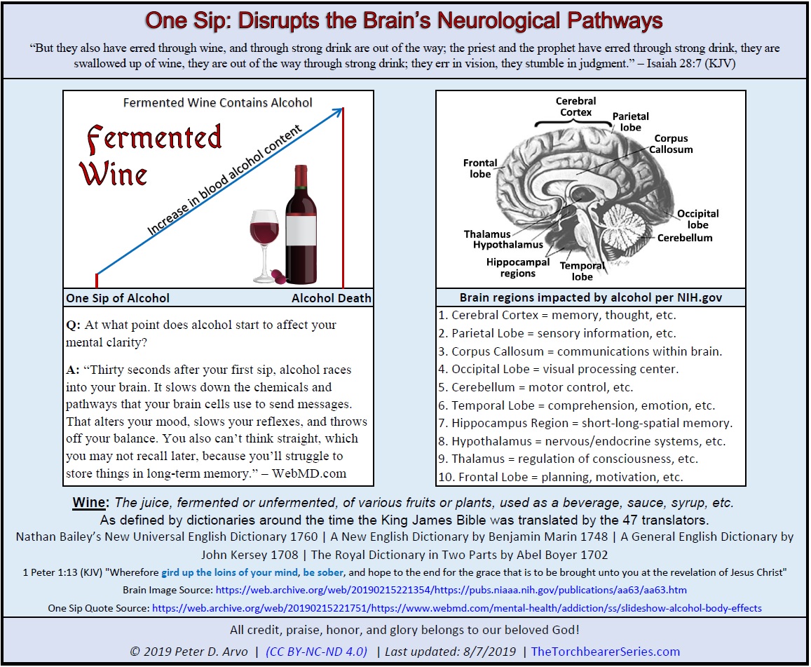 12. There are at least fifteen Bible verses about being sober. See Titus 1:8, 2:12, 1 Peter 1:13, for some examples. We have already shown that one sip of alcohol has a neurological impact on the brain’s ability to think clearly, which is also consistent with how the word sober is used in the Bible as well as how it is defined in old dictionaries around the time the word sober was chosen to be used in the early English Bibles: